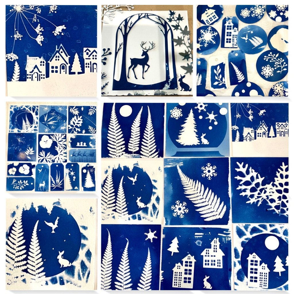 In this workshop we will use plants, paper masks and stencils to create Christmas themed cards and gift labels using the cyanotype process. We will also embellish our cyanotypes with gold, white and a splash of red.