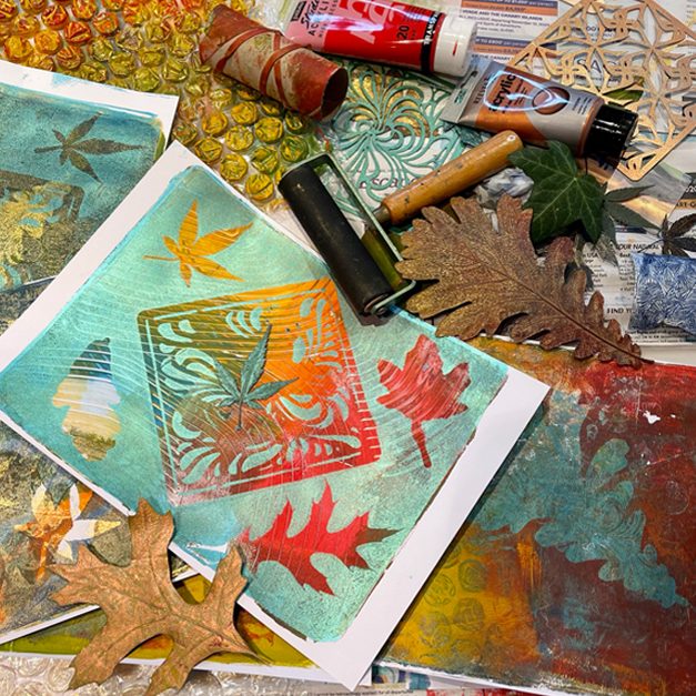 A fun and creative day creating colourful autumnal prints using a gelli-plate. Gelli-plate printing has revolutionised printmaking, making beautiful prints accessible with minimal equipment. These prints can be used for mixed media journaling, greeting cards, gift labels or just a standalone beautiful piece of art. Come and explore this fantastic technique and open up some creative possibilities.